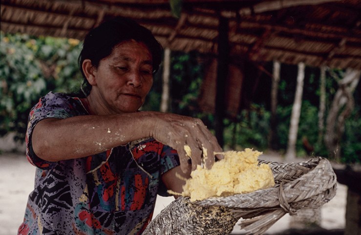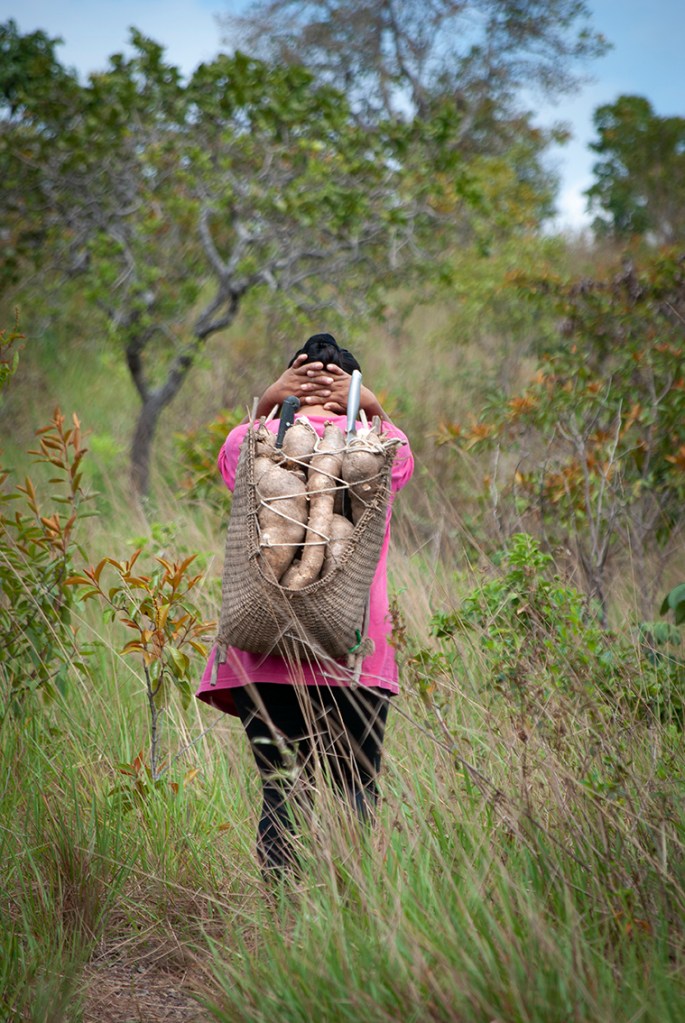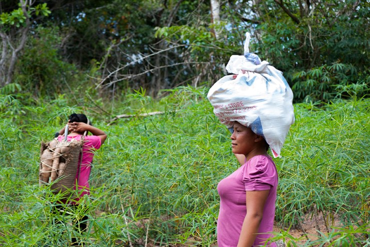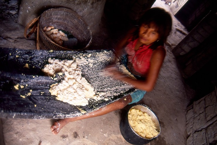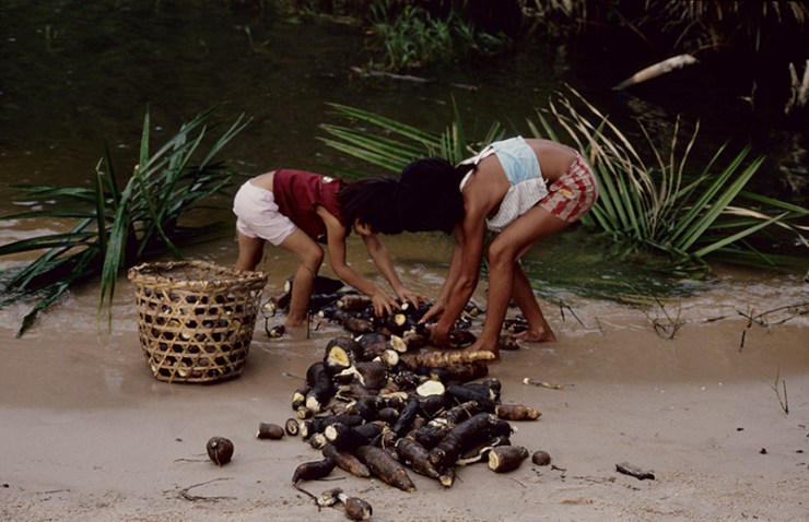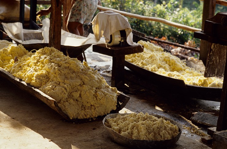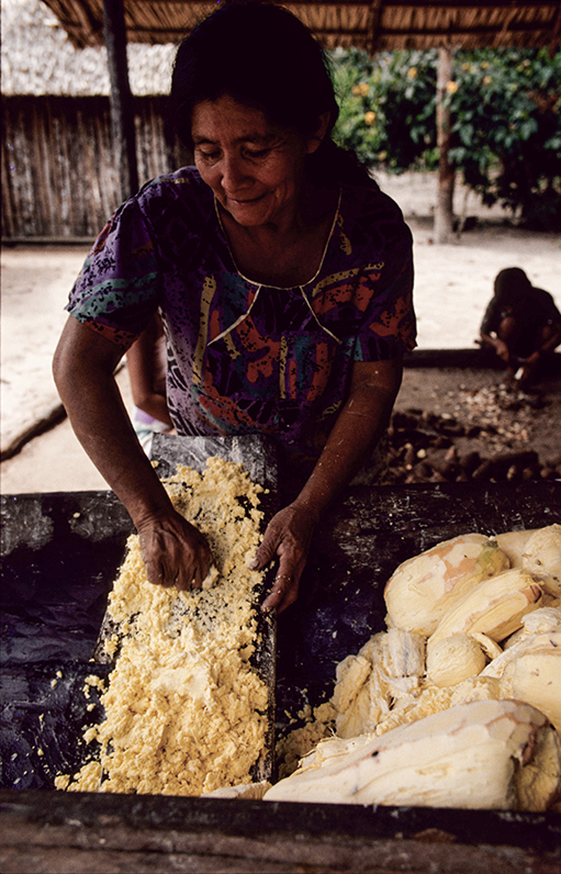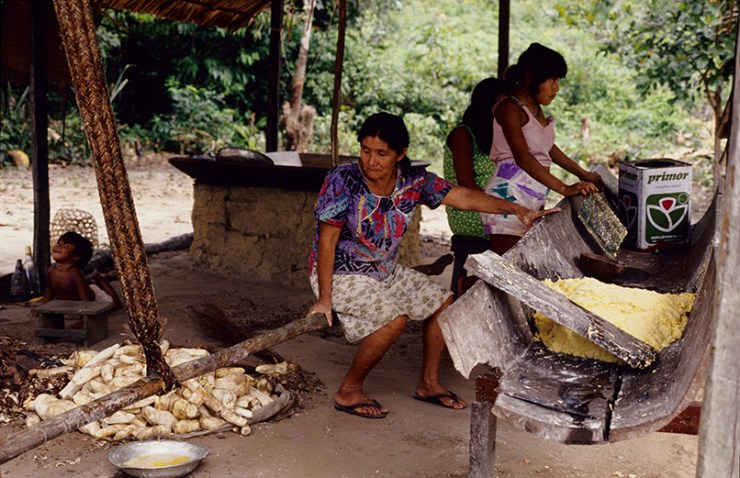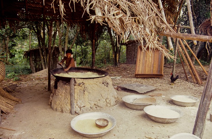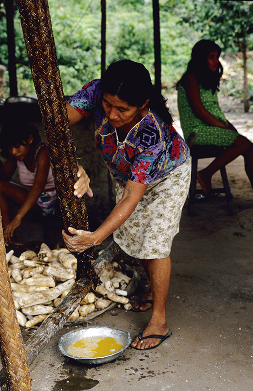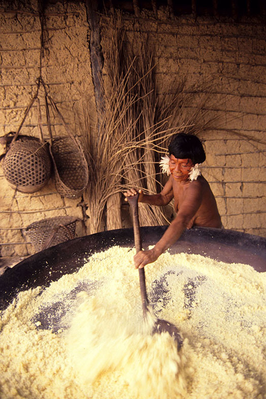 A farinha de mandioca é a base da alimentação na Amazônia e ingrediente essencial da população brasileira. Existem vários tipos de mandioca e a partir da raiz da planta são produzidas as farinhas d’água, farinha seca (amarelas), a tapioca e a goma (brancas). As farinhas são ingredientes de vários outros alimentos típicos da alimentação indígena e brasileira. Na zona rural da Amazônia, quase todas as famílias possuem suas casas de farinha, que também pode ser comunitária. A confecção da farinha é um trabalho primordialmente feminino, mas em várias etapas do processo a família toda ajuda. A mandiocas são colhidas, descascadas e raladas. A massa é então colocada dentro de um objeto cilíndrico e comprido, feito de palha trançada e pendurado no teto da casa de farinha que ao ser esticado, extrai a água da mandioca, o tucupi. A massa seca é então torrada num grande forno se transformando na farinha. O tucupi fica descansando para que o amido ou goma se separe do líquido. O tucupi é venenoso devido à presença do ácido cianídrico, mas o cozimento elimina o veneno. Depois de fermentado de 3 a 5 dias é usado como molho na culinária.