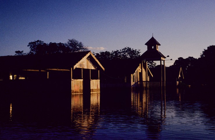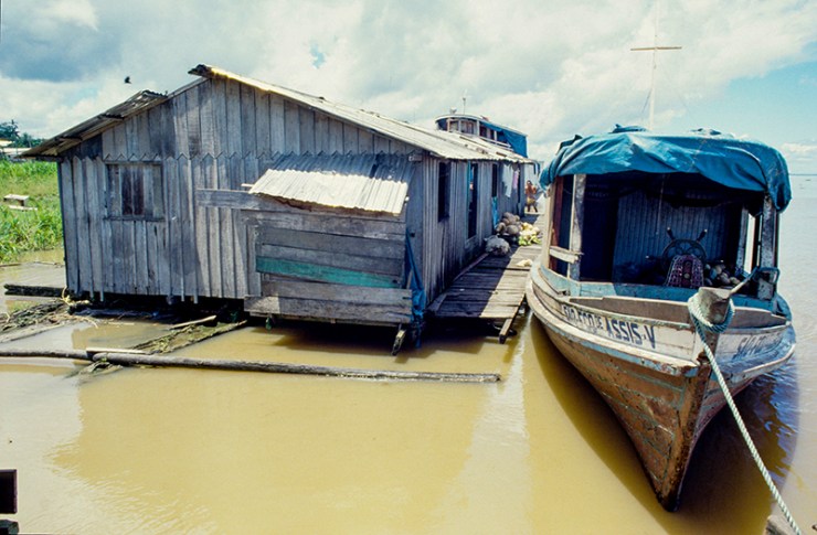 Communities located in lowland areas are flooded on average 4 months a year. The houses are very high stilts that support the flood of the river. Residents build small wooden bridges, planks that connect their houses to the suspended chicken coops, raise pigs on small stilts built for this purpose. The gardens are also suspended. In addition, the only locomotion between the houses is by canoes. They are also used for meetings with friends, under a tree. The vegetation seen in the images is the crown of trees or shrubs. They survives the floods. Another vegetation is the floating grass, which must be “swept” with the paddle, so that it does not attract animals such as alligator and snake. It is common for snakes to invade houses during the flood. It is not an easy environment for survival. Young people and children meet for a chat in the canoes. Floating houses are common on Solimoes river,